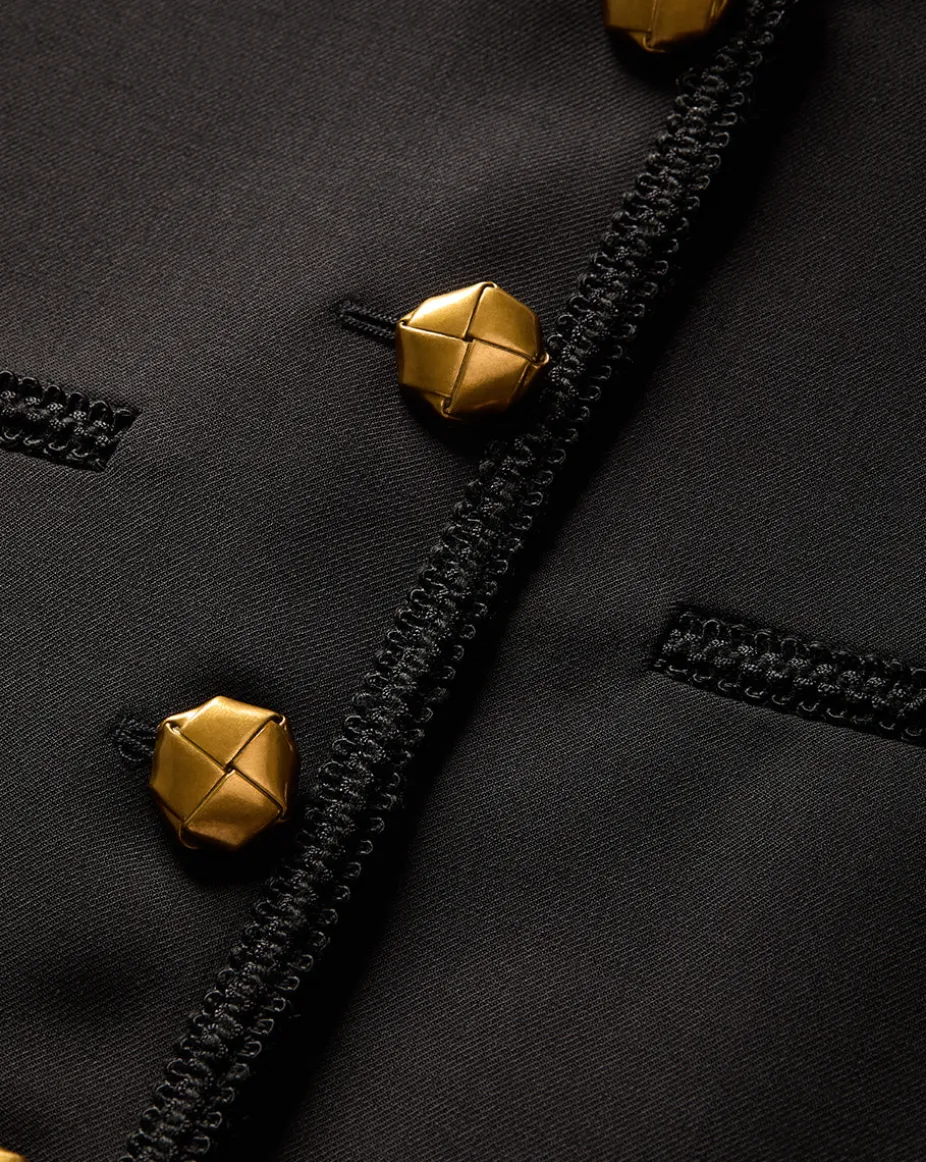 Details include the gold origami-like buttons and a braided trim along the pockets and edges.