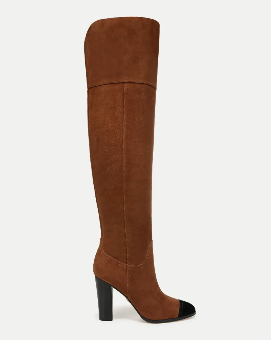 Crafted from smooth suede, this over-the-knee tall boot features an almond cap-toe and side zipper and elevates any look with ease.