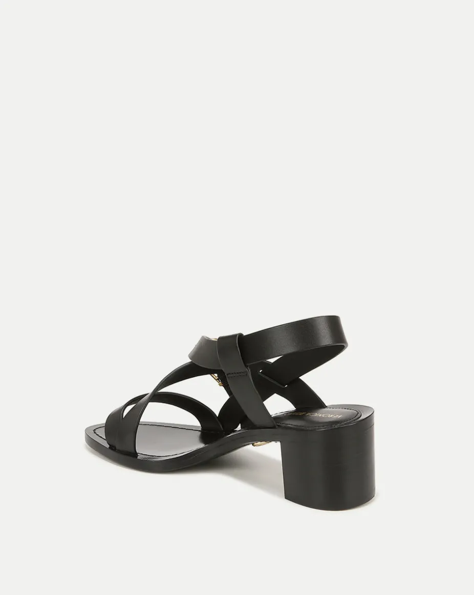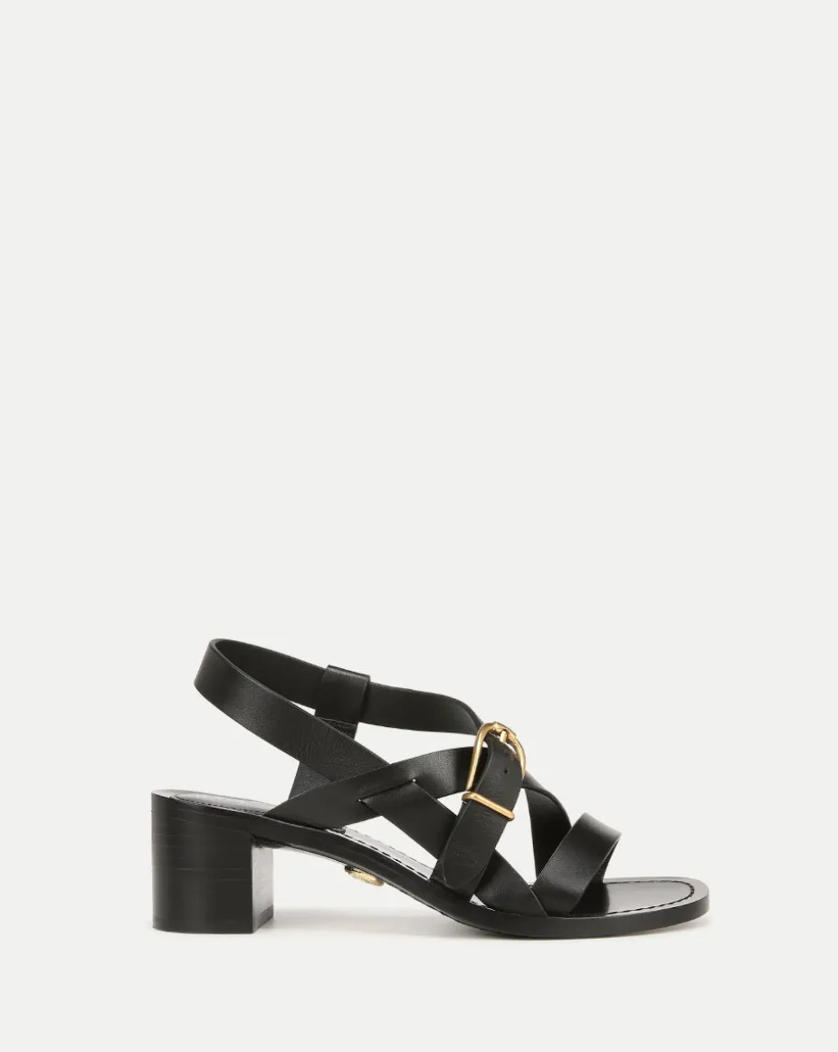 This mid-heel sandal is detailed with perfectly-placed, leather crisscross straps and a gold buckle, framing the foot beautifully.