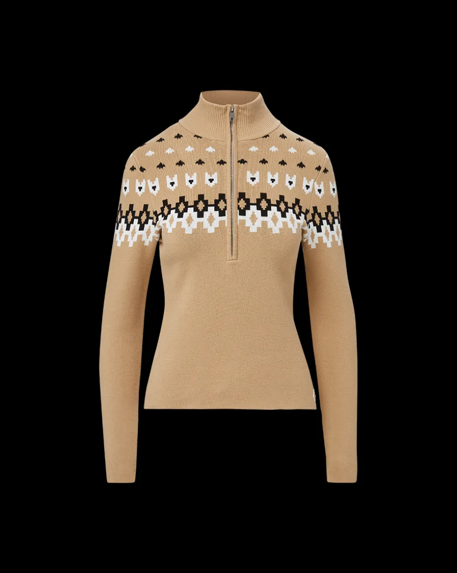 The half-zip design ensures ease of wear while the Icelandic-inspired patterns add an alpine-chic touch.