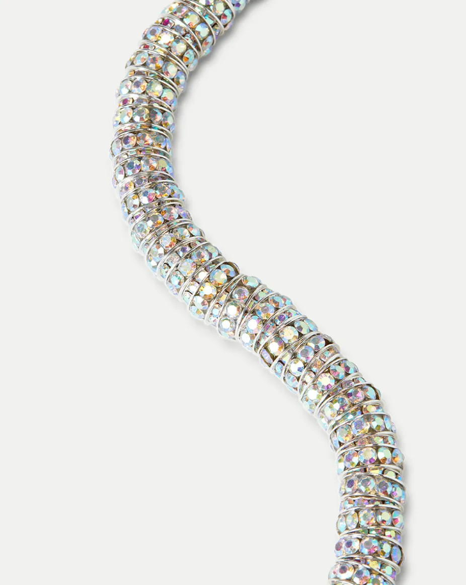 Made with sparkling rondelle beads in silver plated brass, glass crystals, and an oversized silver plated spring ring opener.