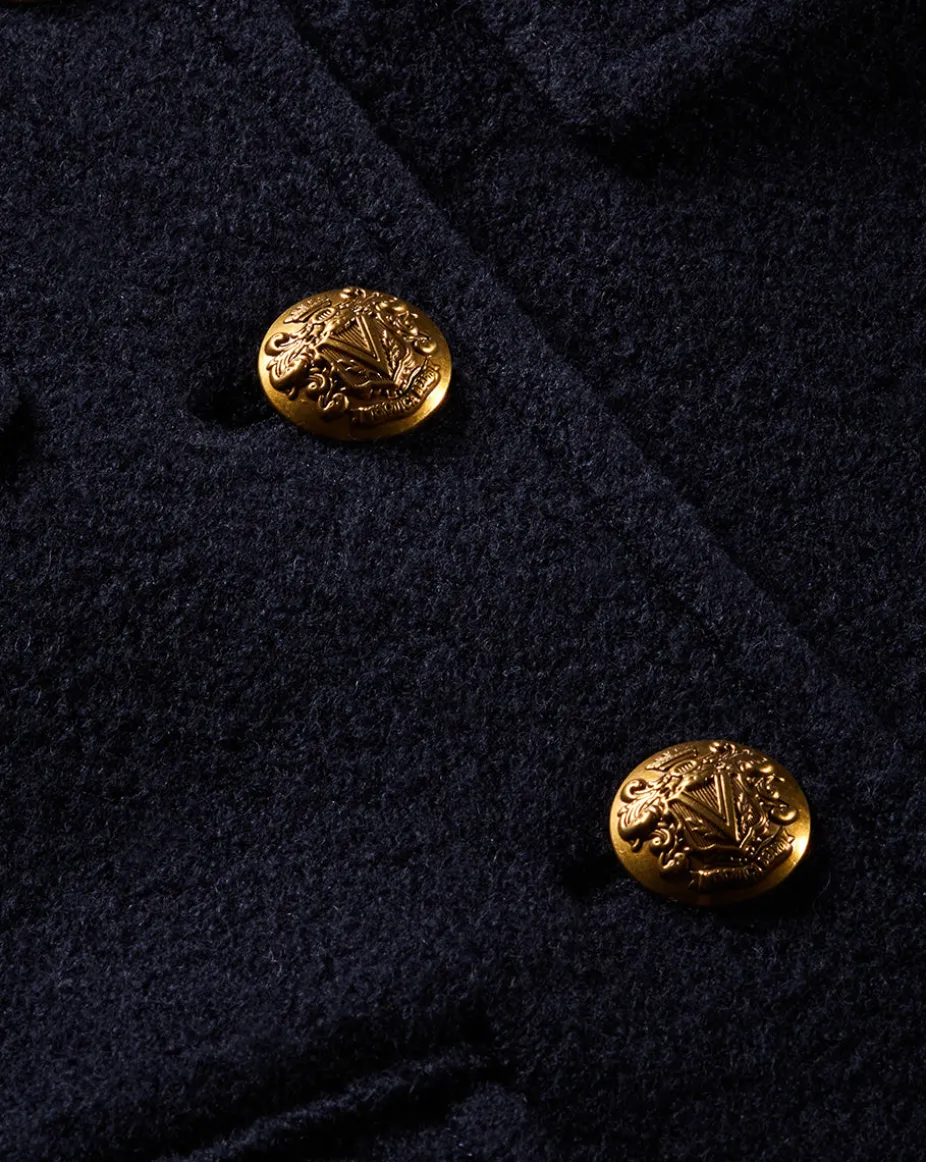 Gold crest buttons and four flap pockets complete the look.