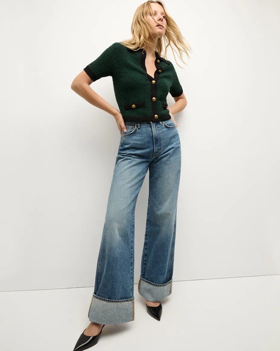Made from textured wool bouclé, the Marie cardigan features a relaxed fit and short sleeves while the contrast-color trim and gold crest buttons adds ladylike polish.