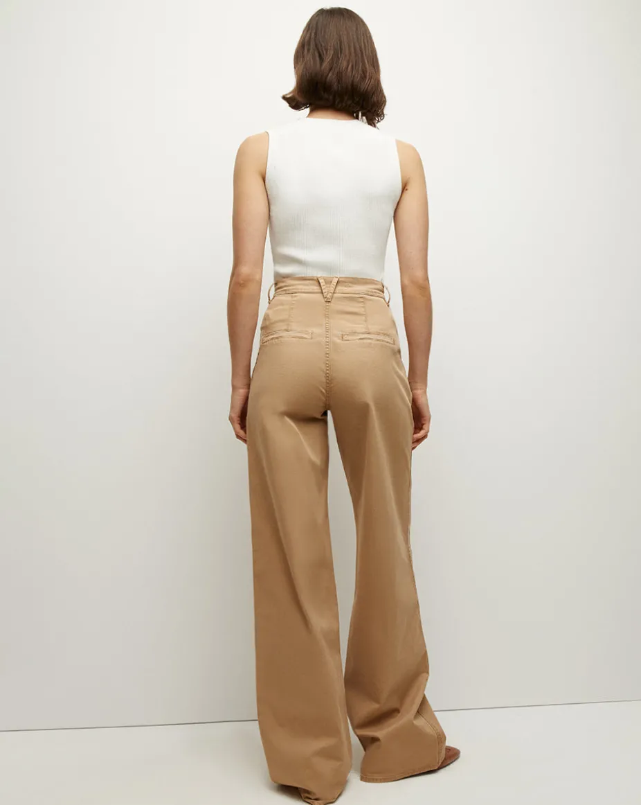 In a new khaki wash with a hint of stretch, the Mia is a high-rise, wide-leg pant with pleats at the waist and our signature V-shape belt loop at the back.