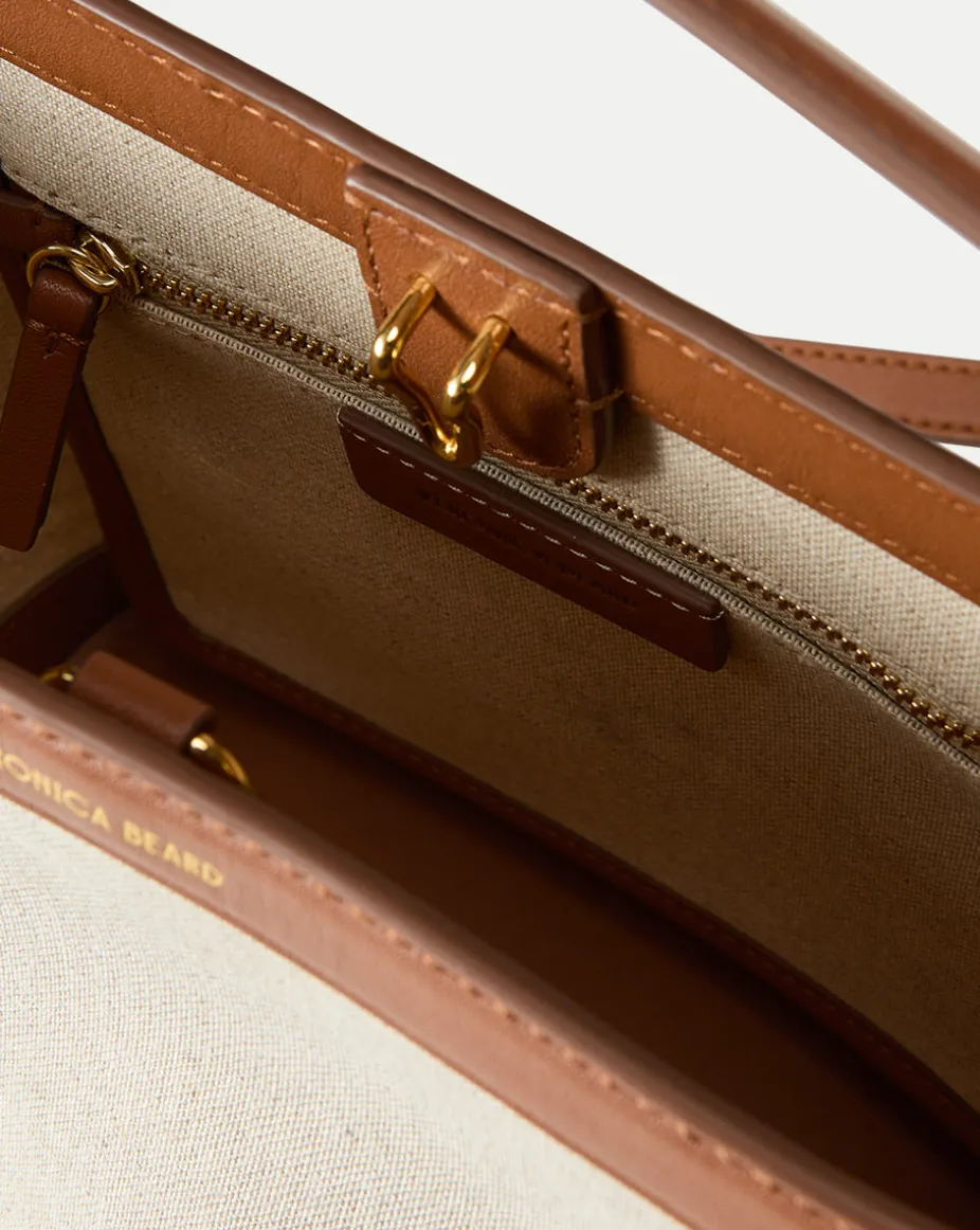 Crafted from linen canvas with leather details, this two-tone style is finished with both a structured top handle and a removable shoulder strap for maximum versatility.