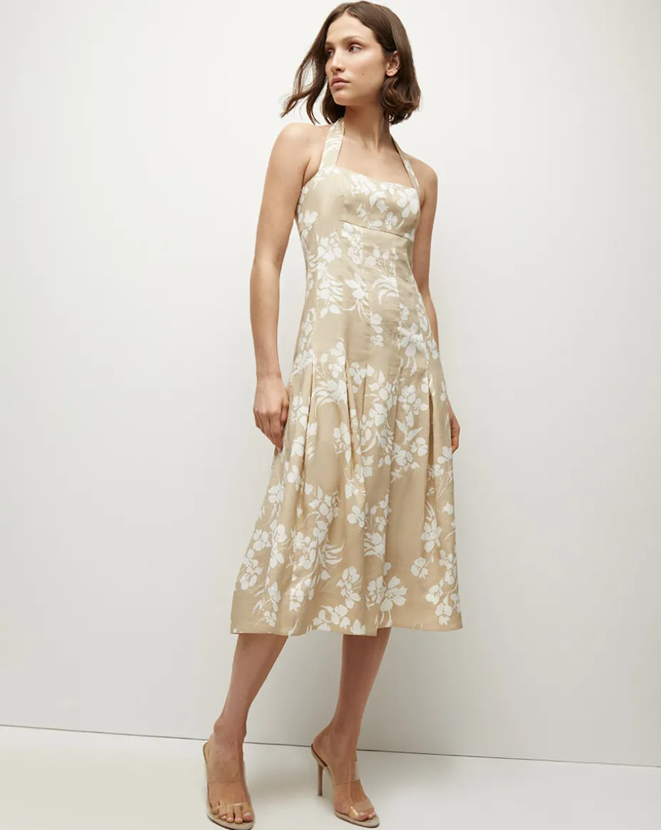 Made from lightweight stretch linen in a neutral floral print, this swingy sundress has an empire waist and a halter neckline that buttons at the nape.