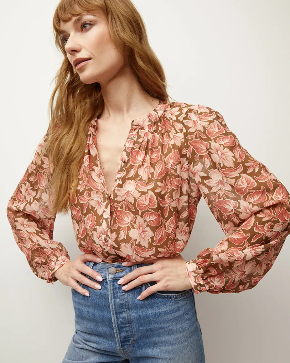 Patterned this season in feminine florals, it’s made from a 100% washed silk georgette and features subtle front-pleating and airy blouson sleeves.