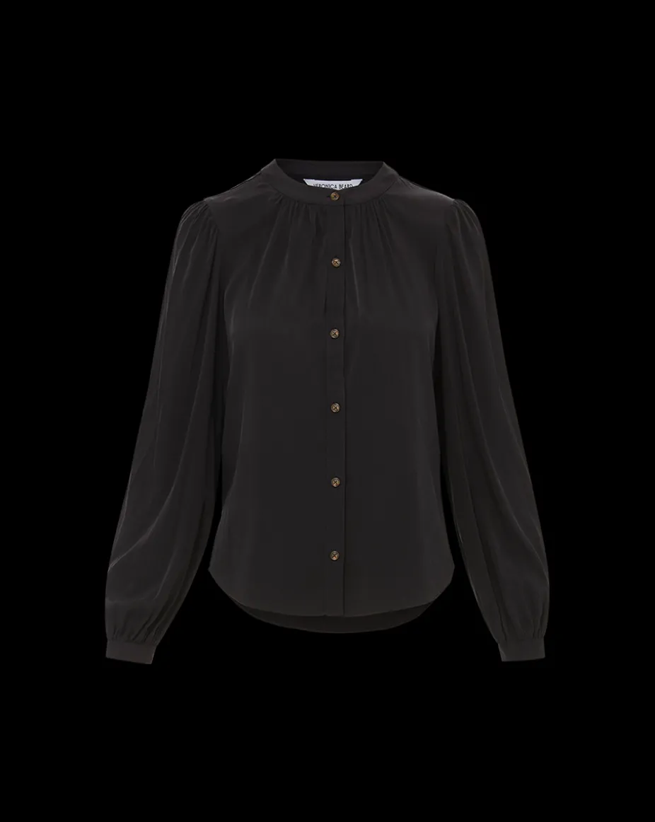 Finished with gentle ruching at the neckline and a curved hem, this is the wear-everywhere black blouse you can easily dress up or down.