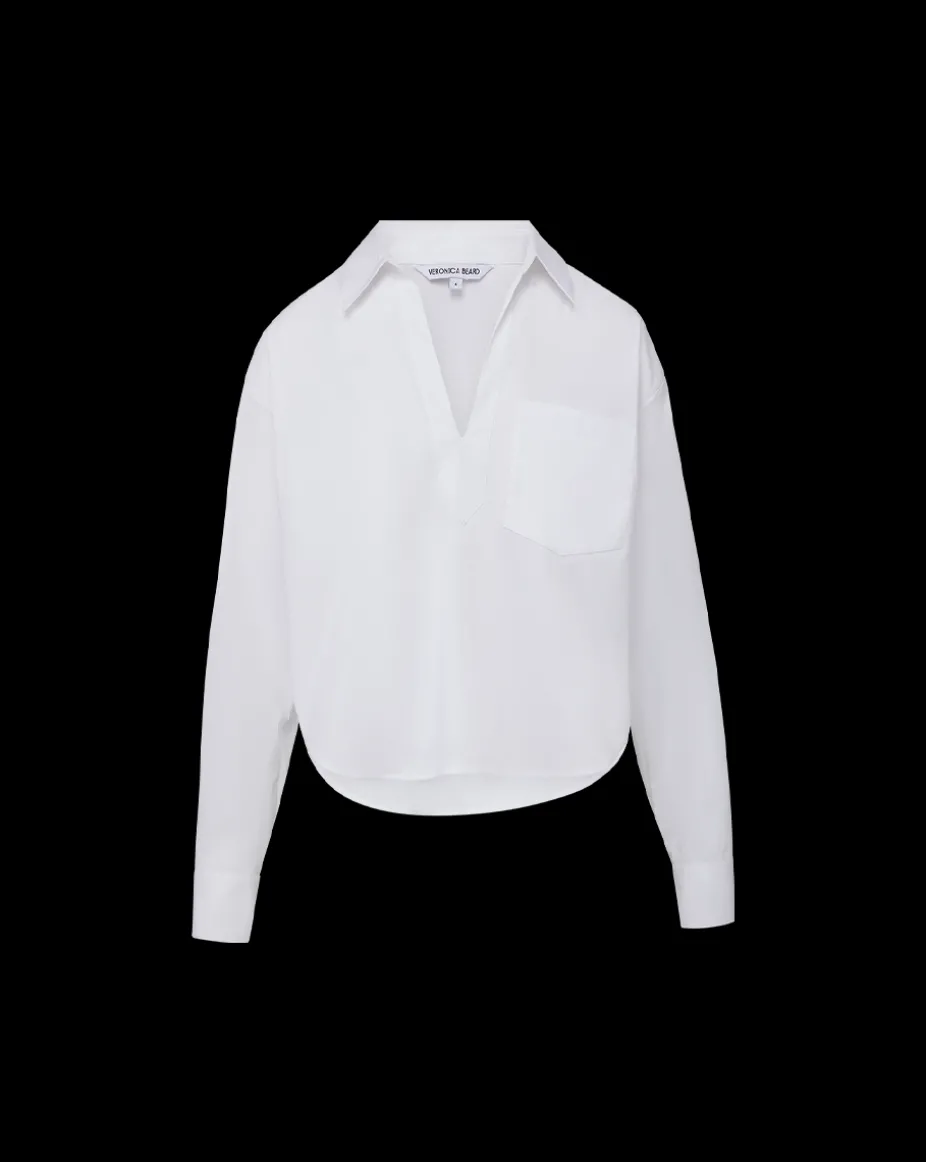 Expertly tailored from premium cotton poplin—with stretch for ease—this billowy, relaxed silhouette is finished with a neat collar, a split V-neck and a single patch pocket.