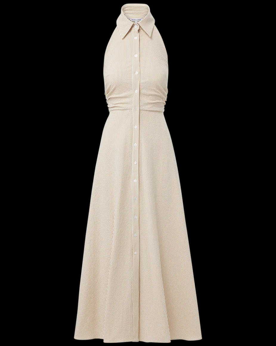 from stretch-cotton seersucker, the Mackey is an A-line shirtdress with a halter neckline and neat collar.
