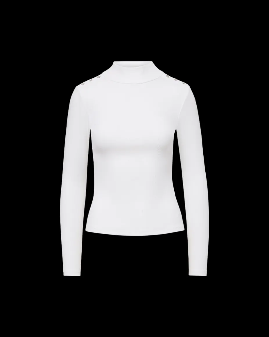 Made from premium stretch cotton, the Nate is defined by a slim fit, a mock neck, and button embellishments on the shoulder.