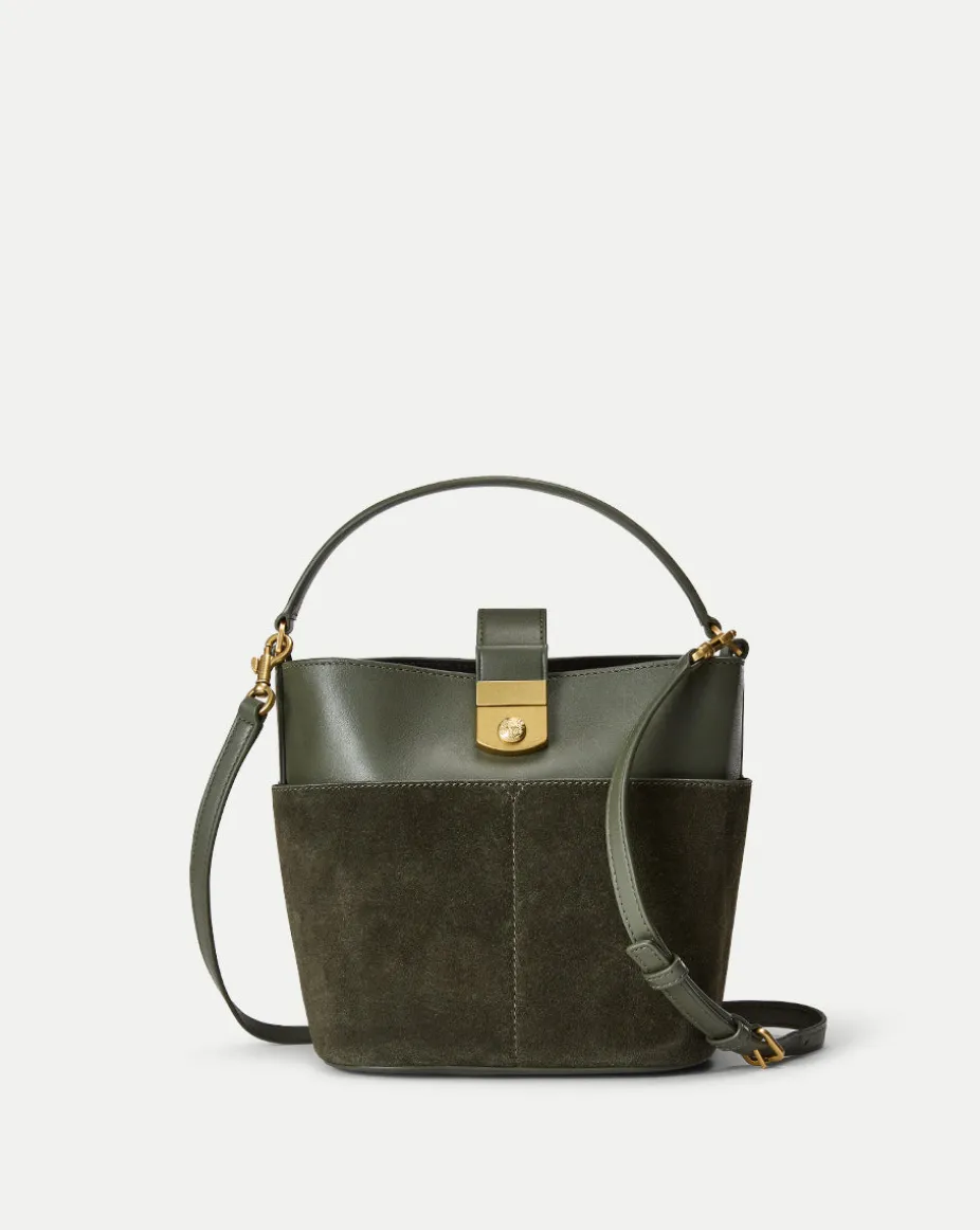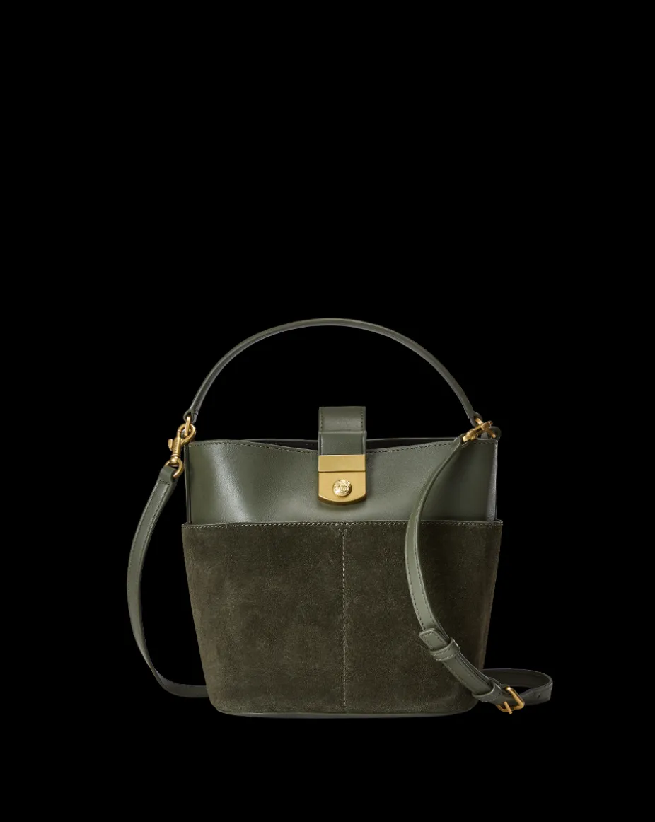Be the first to review “Small Crest Lock Suede Bucket Bag in Pine” Cancel reply