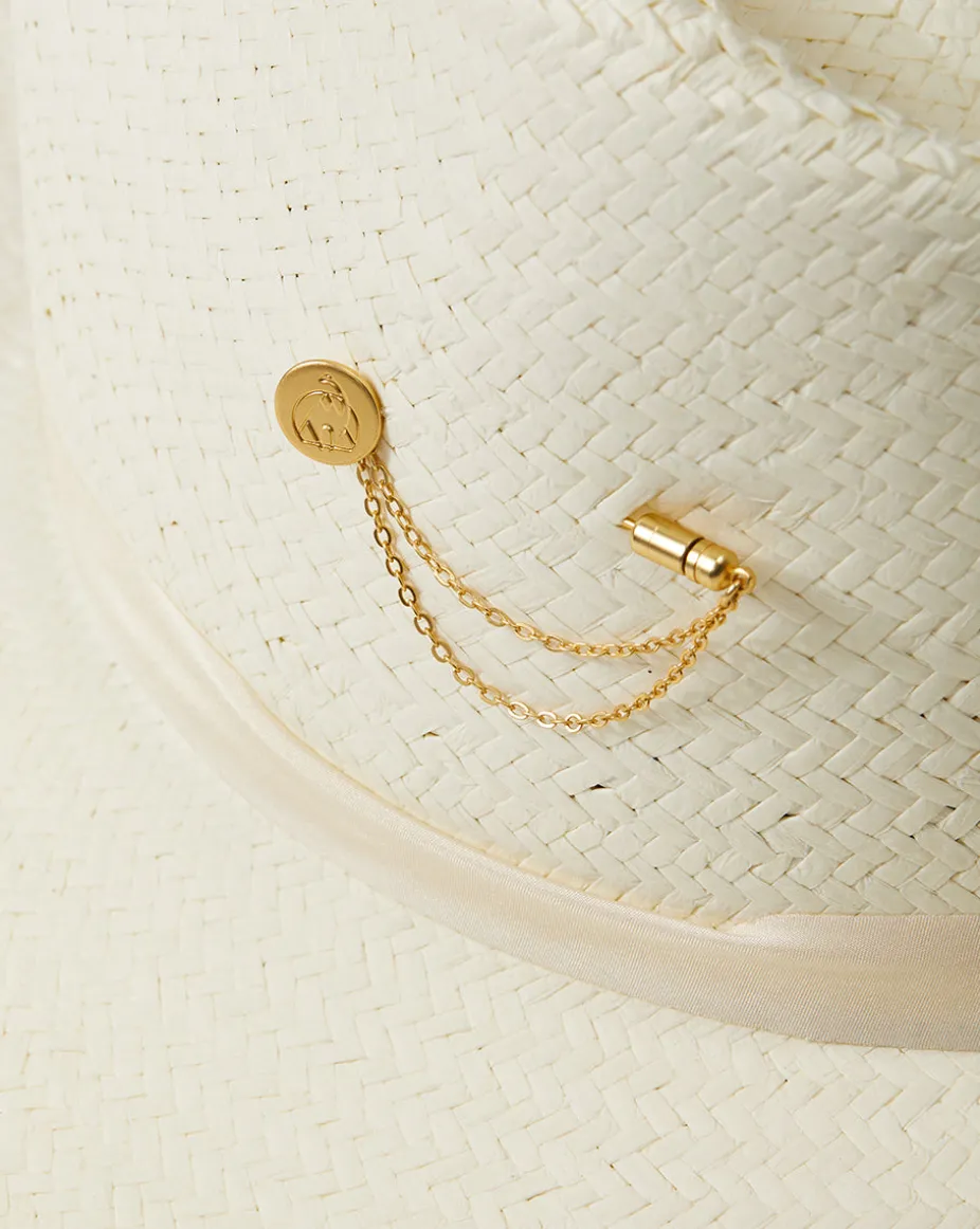 The Wander hat is crafted from an innovative packable straw material and adorned with a hand-dyed ombre silk ribbon and a Freya-branded gold hat pin.